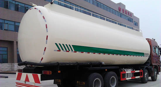 罐體有效容積35立方米.罐體外形尺寸:直段長(zhǎng):8400mm,直徑:2500mm.運(yùn)輸介質(zhì)煙煤粉,密度0.4噸/立方米.選裝同系列高頂駕駛室,同時(shí)平頂,高頂駕駛室選裝無側(cè)風(fēng)窗及遮陽罩.側(cè)面及后下部防護(hù)裝置所用材料為Q235、連接方式為螺栓連接.后部防護(hù)裝置的斷面寬和高為100mm×100mm,下邊緣的最大離地高度為476mm.