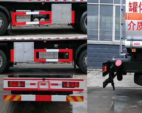 該車為危險品車輛,危險貨物運輸車輛的類型為FL型,類項號:3;罐體有效容積:24.3立方米,介質(zhì):原油,乙醇,密度(千克/立方米)分別為:800,800;罐體尺寸(長×長軸×短軸)(mm)為:8800×2400×1660,8800×2250×1560;側(cè)、后防護均采用Q235材質(zhì)螺栓連接在大梁上,后防護裝置斷面尺寸為(mm):140×50,后部防護離地高度:430mm;ABS系統(tǒng)型號為4460046300,生產(chǎn)企業(yè)為威伯科汽車控制系統(tǒng)(中國)有限公司;ABS系統(tǒng)控制器生產(chǎn)企業(yè)/型號為威伯科(上海)管理有限公司/4460046300;選裝EBS,EBS系統(tǒng)控制器生產(chǎn)企業(yè)/型號為威伯科(上海)管理有限公司/EBS3;隨底盤選裝駕駛室;安裝限速裝置,限速80km/h,排氣管前置,前輪盤式制動器;安裝具有衛(wèi)星定位功能的行駛記錄儀,轉(zhuǎn)向輪裝備輪胎爆胎應(yīng)急防護裝置;發(fā)動機型號及油耗值(L/100km)為:MC07.31-60(38.2),MC07.34-60(38.2).