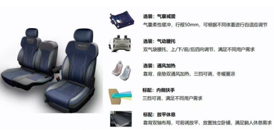 座椅:主駕標(biāo)配內(nèi)側(cè)扶手、放平休息功能,選裝氣囊減震、氣動(dòng)腰托、通風(fēng)加熱等舒適性配置,舒適性提升; 選裝:氣囊減震 氣囊柔性緩沖,行程50mm,可根據(jù)不同體重進(jìn)行自適應(yīng)調(diào)節(jié) 選裝:氣動(dòng)腰托 領(lǐng)航卡車 雙氣袋腰托,上/下/前/后四向調(diào)節(jié),滿足不同用戶需求 選裝:通風(fēng)加熱 靠背、座墊雙通風(fēng)加熱,三擋可調(diào),冬暖夏涼 標(biāo)配:內(nèi)側(cè)扶手 三擋可調(diào),滿足不同用戶需求 標(biāo)配:放平休息 靠背雙軸布局,可前調(diào)放平,放置獨(dú)立臥鋪,滿足躺人休息需求