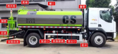罐體采用4mm厚碳鋼板制作,容積約14立方米,配杭州威龍水泵(可泵進(jìn)泵出),帶前沖、后灑、側(cè)噴,罐體右側(cè)靠尾部帶兩個高位花灑,后工作平臺為沖孔平臺,防滑式踏板,帶綠化灑水高炮,水位計,球閥式消防栓接口和DN65泵進(jìn)出口裝在副駕駛一側(cè),正駕駛尾部一個球閥式消防栓上水口(管道伸入罐體內(nèi)2/3高度位置),正駕駛尾部一根直徑65與后保險杠等長的噴水管(直徑65的管鉆兩排孔朝下噴水),整車全通徑球閥,主管道直徑80,其余出口為65,一個工具箱,后尾部管道左右各一個1寸的洗手閥,罐尾左右各一個圓警燈,兩根與罐體等長的輸水管,其余為工廠標(biāo)準(zhǔn)配置。