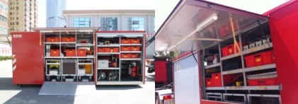 箱體內(nèi)根據(jù)器材使用方式不同設(shè)置有各種專用拖架、破拆工具拖架、抽屜、推車模塊、可調(diào)器材盒等機(jī)構(gòu)放置和固定各種器材裝備,在裝卸和運(yùn)輸過程中不會(huì)發(fā)生移動(dòng)。